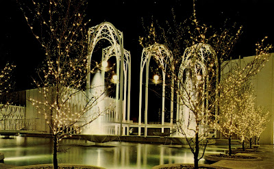 "Pacific Science Center was a major exhibit at the 1962 Seattle World's Fair as the U.S. Science Pavilion and now is a prime attraction at Seattle Center. Soaring Gothic arches, fountains and fairyland lighting create a beautiful setting for the Center's world-famous collection of scientific exhibits. Seattle's Space Needle towers over all." C13555a - Color photo by Mike Roberts.
